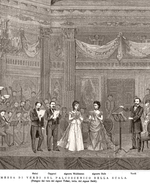 Aufführung der Messa da Requiem, an der Scala 1874, mit Verdi als Dirigent. Zeichnung von Osvaldo Tofani. © Wikimedia